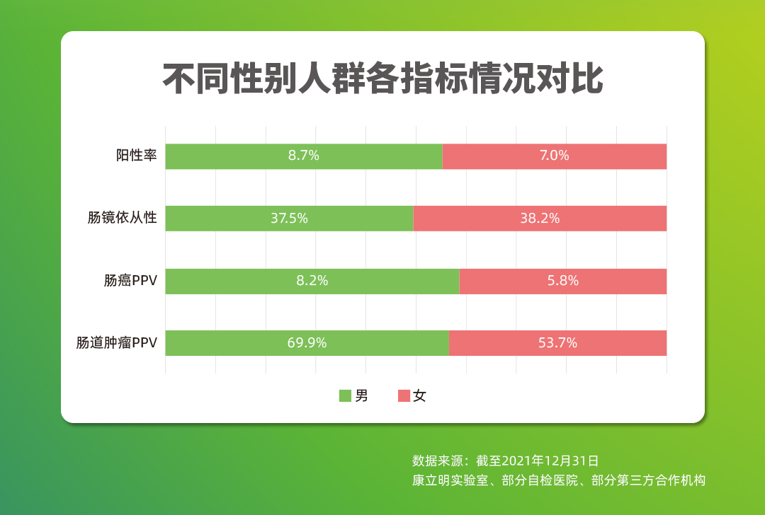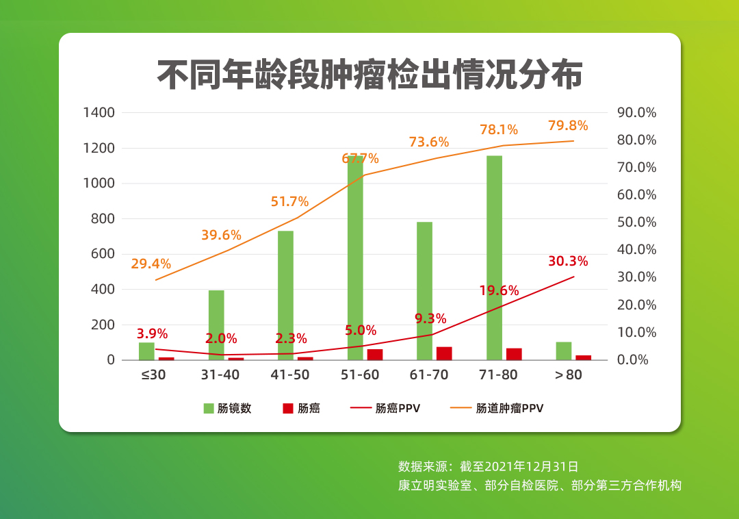 截至2021年12月,作為持續(xù)披露真實世界應用數(shù)據(jù)的腸癌糞便基因檢測產(chǎn)品,長安心®共完成33萬例前瞻性應用檢測,其中175528例應用數(shù)據(jù)可追溯,12114例受檢者長安心®檢測結(jié)果陽性(陽性率6.9%),其中4970例長安心®檢測結(jié)果陽性的受檢者進行了腸鏡復查(腸鏡依從性41.0%),一共發(fā)現(xiàn)3408例需要治療的受檢者,其中755例腸癌,1444例腺瘤,1209例息肉。長安心®對腸道腫瘤的預測值(PPV)為68.6%(其中腸癌的陽性預測值為15.2%),來自國家科技部項目的數(shù)據(jù)顯示,長安心®的陰性預測值更是高達99.9%。