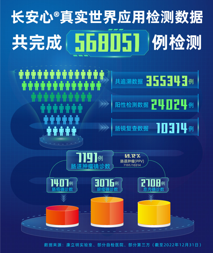 作為持續(xù)披露真實(shí)世界應(yīng)用數(shù)據(jù)的腸癌糞便基因檢測產(chǎn)品,截至2022年12月31日,長安心®共完成568051例真實(shí)世界應(yīng)用檢測,其中355343例應(yīng)用數(shù)據(jù)可追溯,24024例受檢者長安心檢測結(jié)果陽性(陽性率6.76%),其中10314例陽性檢測結(jié)果的受檢者進(jìn)行了腸鏡復(fù)查(腸鏡依從性42.93%),有7191例受檢者確診腸道腫瘤,其中1407例腸癌,3076例腺瘤,2708例息肉。