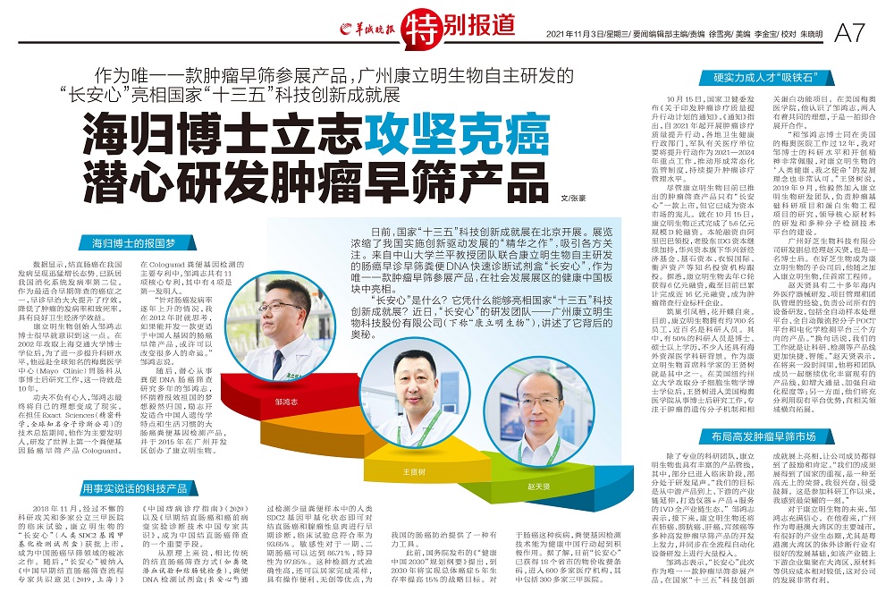 引言:日前,“長(zhǎng)安心”產(chǎn)品在“十三五”科技創(chuàng)新成就展亮相,吸引了各界的關(guān)注??盗⒚魃飫?chuàng)始人、腸癌早篩技術(shù)發(fā)明人鄒鴻志博士及科學(xué)家團(tuán)隊(duì)接受媒體記者采訪,暢談科技報(bào)國(guó)、潛心研發(fā)腫瘤早篩產(chǎn)品的心路歷程。