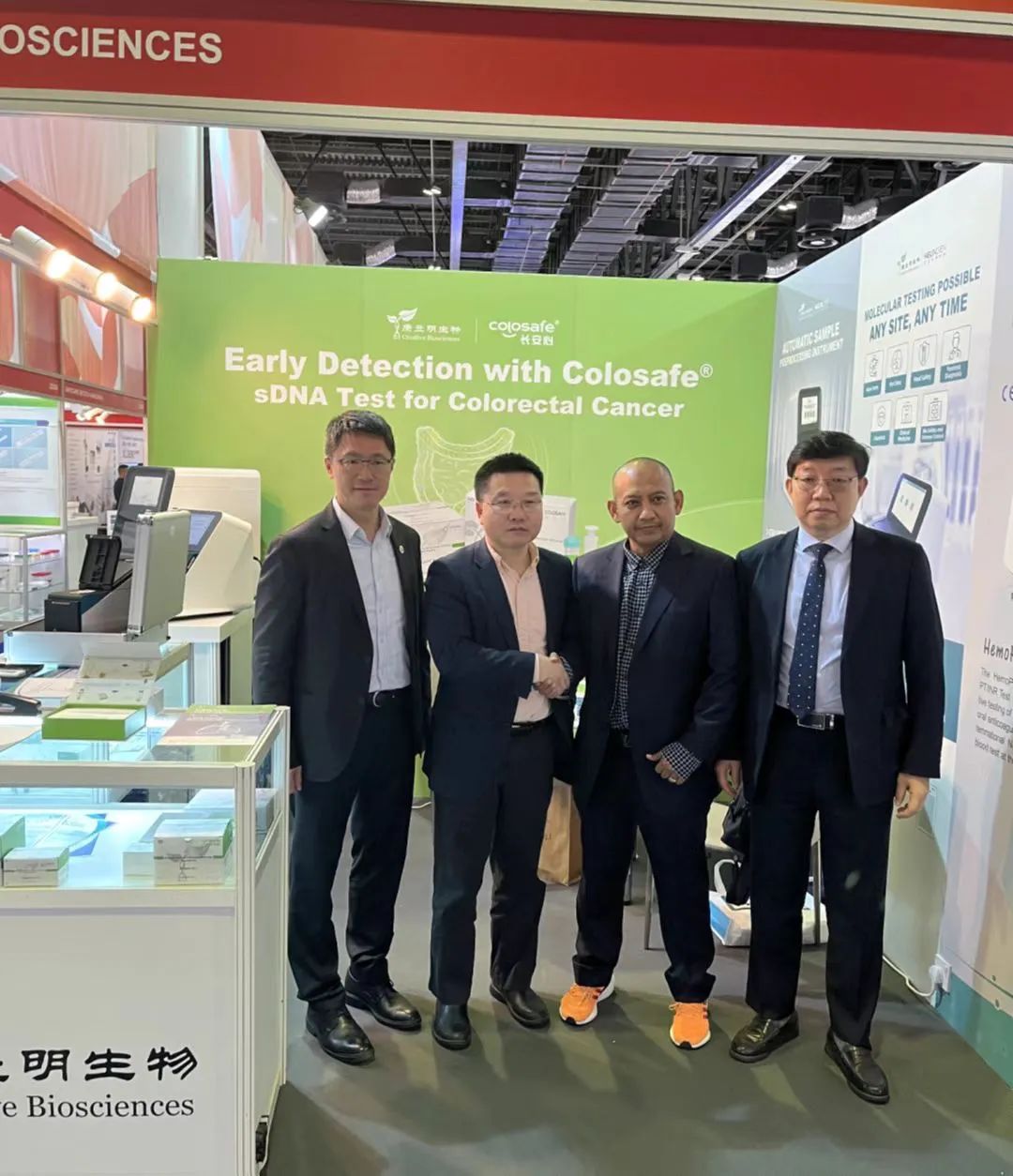 展會(huì)上,康立明生物創(chuàng)始人、腸癌早篩技術(shù)發(fā)明人鄒鴻志博士親臨現(xiàn)場(chǎng),并帶領(lǐng)專(zhuān)業(yè)團(tuán)隊(duì)為多方客戶熱情專(zhuān)業(yè)的講解,共同交流,洽談合作。并介紹了長(zhǎng)安心®目前在國(guó)內(nèi)568051例應(yīng)用檢測(cè)(截至2022年12月31日)的成功模式與經(jīng)驗(yàn)。