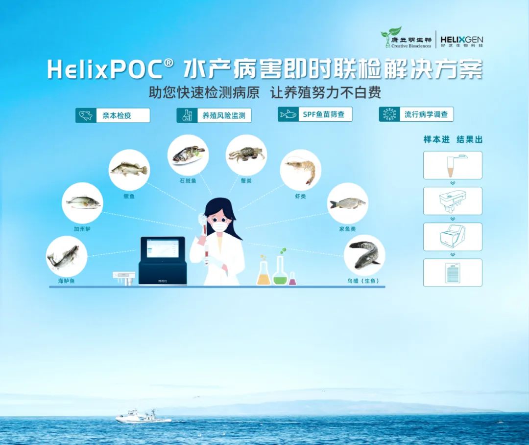 好芝生物以水產(chǎn)養(yǎng)殖病害防治為切入點(diǎn),以養(yǎng)殖物種為檢測(cè)服務(wù)單元,提出水產(chǎn)病害即時(shí)聯(lián)檢解決方案。產(chǎn)品基于HelixPOC®全自動(dòng)微流控核酸檢測(cè)一體機(jī)、水產(chǎn)病害核酸檢測(cè)試劑盒,針對(duì)水產(chǎn)不同細(xì)分種類的病害,實(shí)現(xiàn)樣本進(jìn)、結(jié)果出的全自動(dòng)化流程,無需專業(yè)操作人員及實(shí)驗(yàn)室,滿足現(xiàn)場(chǎng)快速需求,面向規(guī)?;?、集約化的水產(chǎn)養(yǎng)殖基地、種苗基地、水產(chǎn)檢測(cè)中心等場(chǎng)景。檢測(cè)水產(chǎn)養(yǎng)殖物種涵蓋南美白對(duì)蝦、羅氏沼蝦、克氏原螯蝦、小龍蝦、青蟹、鱖魚、加州鱸、海鱸魚、石斑魚、金鯧魚、草魚、烏鱧、鯽魚等 。