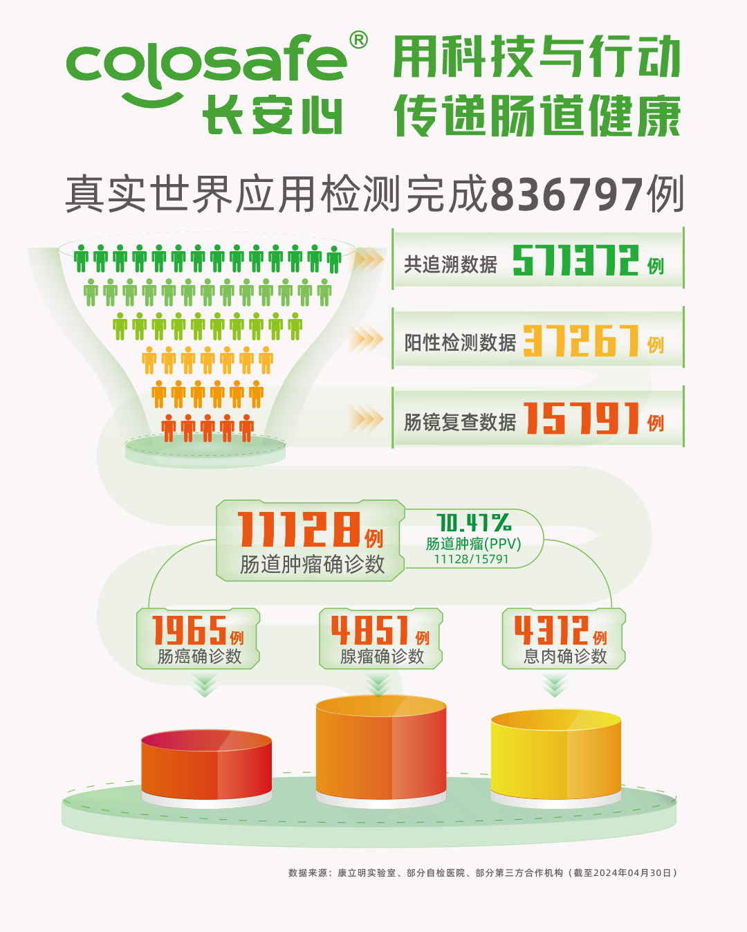 截至2024年4月30日,長(zhǎng)安心®共完成836797例檢測(cè),其中可追溯數(shù)據(jù)571372例。檢測(cè)結(jié)果陽性37267例(陽性率6.52%),均建議進(jìn)行腸鏡復(fù)查。其中,15791例檢測(cè)陽性受檢者進(jìn)行了腸鏡復(fù)查(腸鏡依從性42.37%),共發(fā)現(xiàn)11128例需要治療的受檢者,其中腸癌1965例、腺瘤4851例、息肉4312例。長(zhǎng)安心®腸癌陽性預(yù)測(cè)值(PPV)12.44%,腸道腫瘤陽性預(yù)測(cè)值(PPV)70.47%,檢測(cè)性能優(yōu)異。