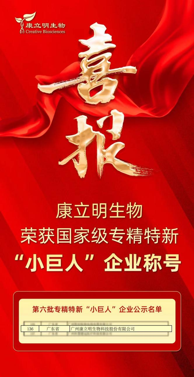 喜報(bào)!康立明生物榮獲國家級專精特新“小巨人”企業(yè)稱號