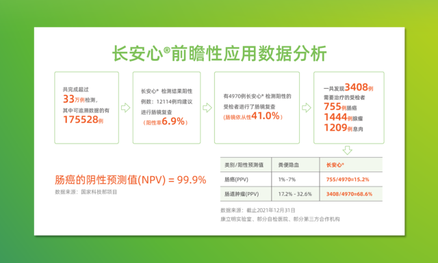 糞便DNA檢測(cè)技術(shù),正成為腸癌篩查中的重要一環(huán)。康立明生物首席市場(chǎng)官鄧曉琴發(fā)布的腸癌糞便基因檢測(cè)產(chǎn)品“長(zhǎng)安心”最新前瞻性應(yīng)用數(shù)據(jù)顯示,截至2021年12月,長(zhǎng)安心共完成33萬(wàn)例前瞻性篩查,其中175528例篩查數(shù)據(jù)可追溯,12114例受檢者檢測(cè)結(jié)果陽(yáng)性(陽(yáng)性率6.9%),其中4970例檢測(cè)結(jié)果陽(yáng)性的受檢者進(jìn)行了腸鏡復(fù)查(腸鏡依從性41.0%),一共發(fā)現(xiàn)3408例需要治療的受檢者,其中755例腸癌,1444例腺瘤,1209例息肉。“長(zhǎng)安心”對(duì)腸道腫瘤的陽(yáng)性預(yù)測(cè)值(PPV)為68.6%(其中腸癌的陽(yáng)性預(yù)測(cè)值為15.2%),來(lái)自國(guó)家科技部項(xiàng)目的數(shù)據(jù)顯示,長(zhǎng)安心的陰性預(yù)測(cè)值達(dá)99.9%。